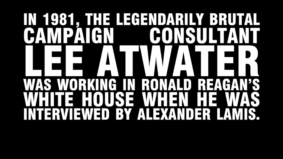 Exclusive: Lee Atwater’s Infamous 1981 Interview on the Southern Strategy In 1981, the legendarily brutal campaign consultant Lee Atwater, after a decade as South Carolina’s most effective Republican operative, was working in Ronald Reagan’s White House when he was interviewed by Alexander Lamis, a political scientist at Case Western Reserve University. [Video 1:39 (offensive language)]