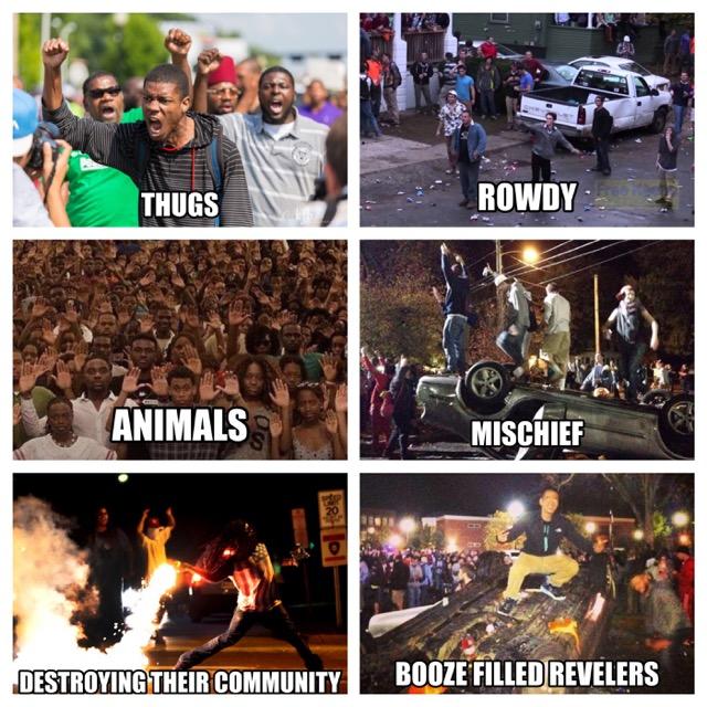 During Pumpkinfest in New Hampshire, a predominantly white crowd destroyed street signs, threw liquor bottles and billiard balls, set fires, pushed barricades, shouted curses at police officers, and flipped at least one car, resulting in more than 30 people injured. Although the two situations are not equivalent, representations from media coverage of this event (as well as riots after big sports team victories) vs. Ferguson reveal the racial biases of media. Even more telling is the different public perception when it is white people who are rioting. Ask yourself these questions: How is it that that behavior of some black people is used to condemn and dismiss the entire Black community and their concerns, while the behavior of some white people is excused and explained away? Why is it when white people riot, there isn’t blame placed on “white culture,” or that whites aren’t seen as inherently lawless, or that all white people aren’t expected to take responsibility for the actions of a few?
