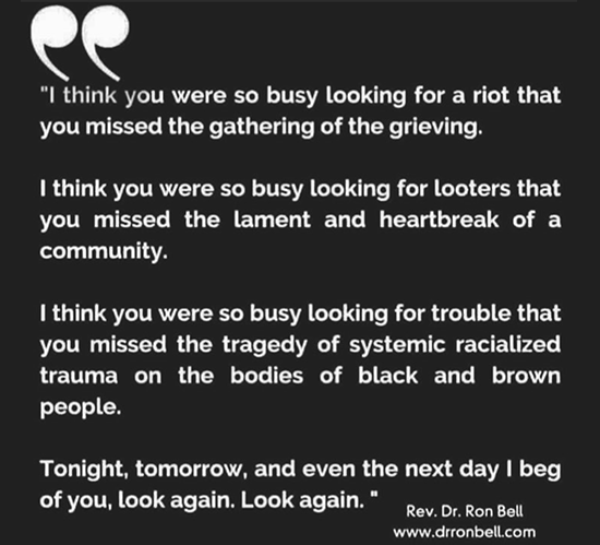“I think you were so busy looking for a riot that you missed the gathering of the grieving. I think you were so busy looking for looters that you missed the lament and heartbreak of a community. I think you were so busy looking for trouble that you missed the tragedy of systemic racialized trauma on the bodies of black and brown people. Tonight, tomorrow, and even the next day I beg of you, look again. Look again.” – Rev. Dr. Ron Bell