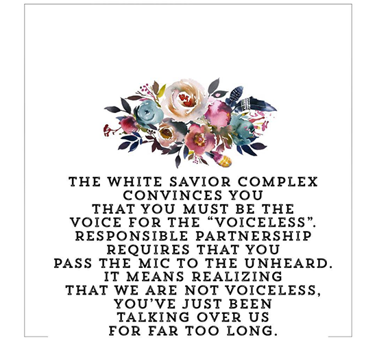 “You want to fix things, I know. So often, materially wealthy westerners rush in to our communities assuming they have the answers to complex problems. Real, equitable and responsible partnerships can be a beautiful and effective way to address something like the world’s ‘orphan crisis’…. which is so vastly misunderstood and therefore inadequately and inappropriately addressed • You do not need to be our voice but you can help support the work that we know needs to be done in our communities. Come beside, let us teach you and lead you for a change. It might feel weird at first, but I promise you that this is an important power shift that needs to happen in the culture of development and missions….